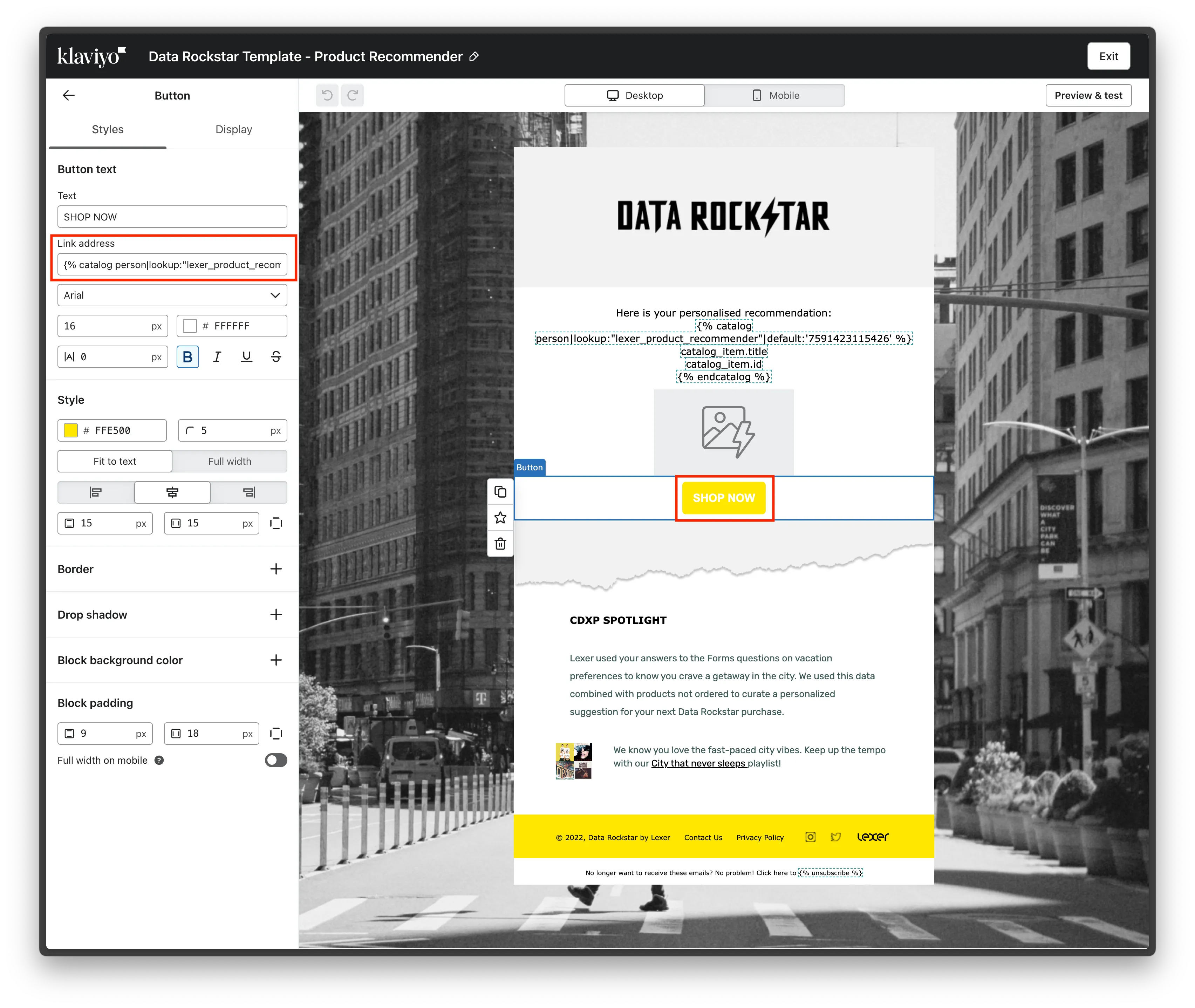 Add a Button to your email so we can link to the product in Shopify. Add this code snippet to the Link address field on the left side of the screen.